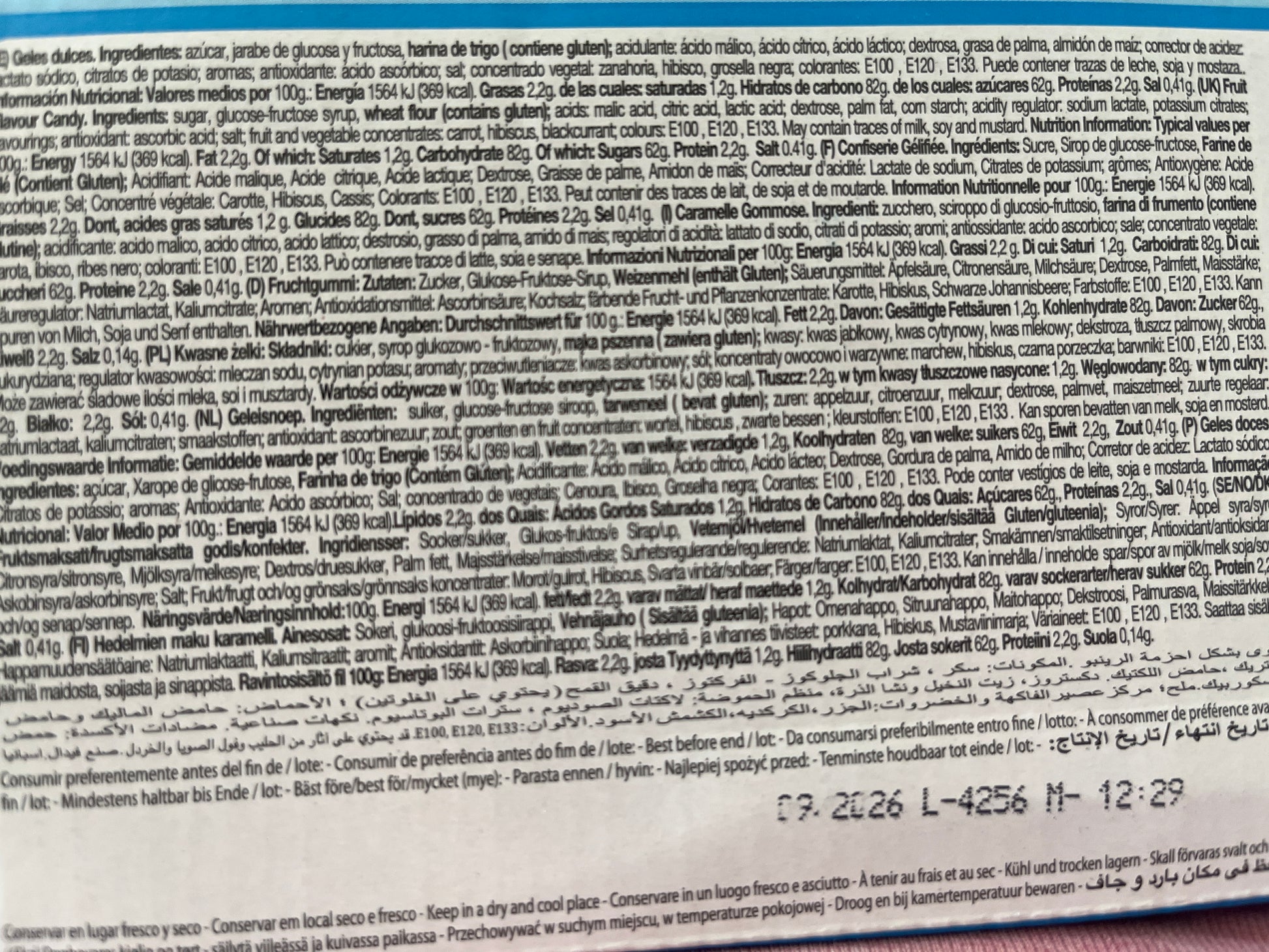 Sucre, sirop de glucose-fructose, amidon de maïs, sirop de sucre inverti, amidon de blé (contient du gluten), farine de blé, acidifiant: acide malique, acide citrique, graisse de palme, humectant: glycérol, arômes, correcteur d'acidité: citrates de potassium, sel, colorant: E100, E120, E133