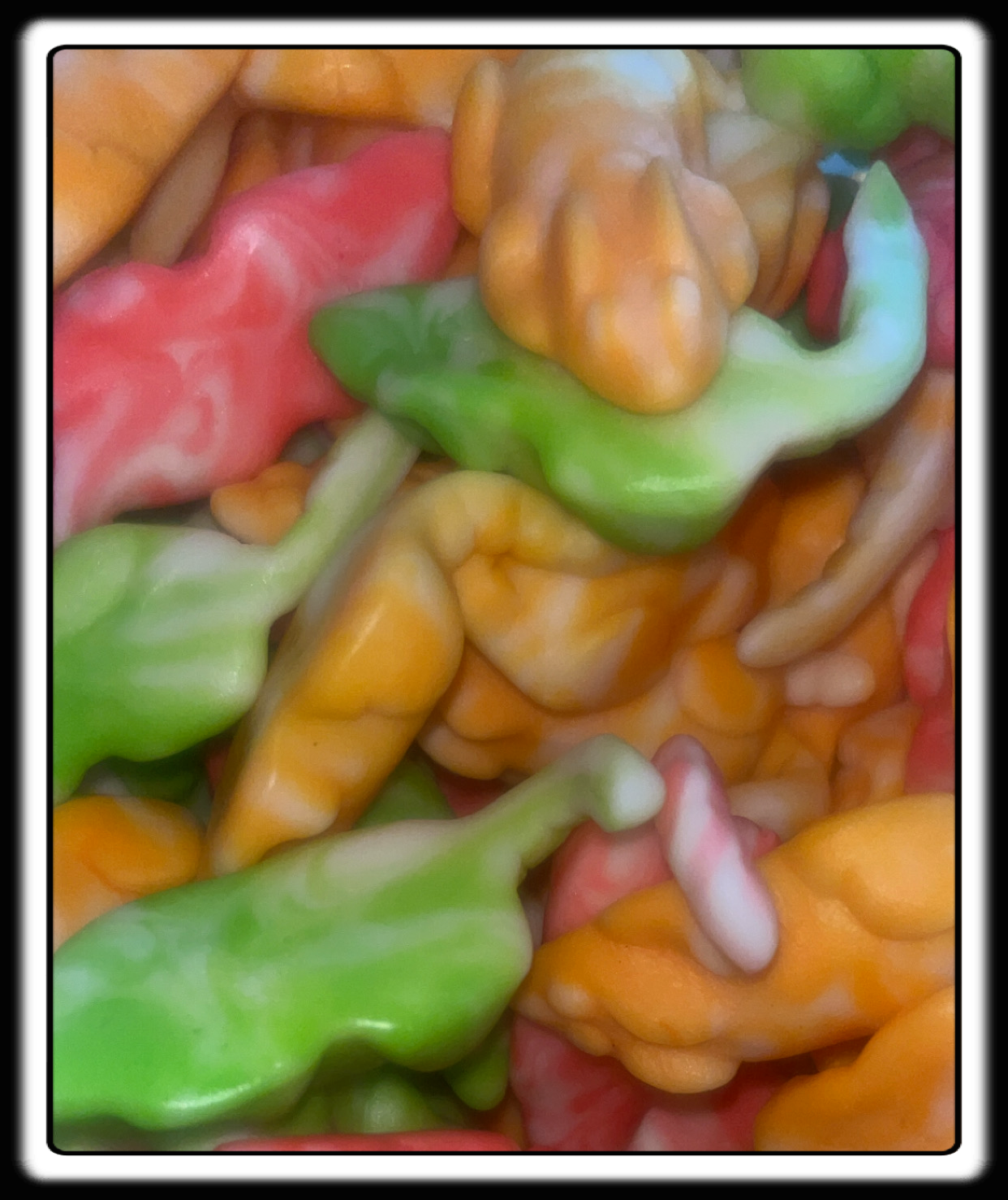 Sirop de glucose-sucre, eau, amidon modifié de pomme de terre-gélatine, acidifiants E330,E296,E270- Arôme, colorant,( E102, E129, E133, E516),huile végétale, agent démoulage cire de carnauba.